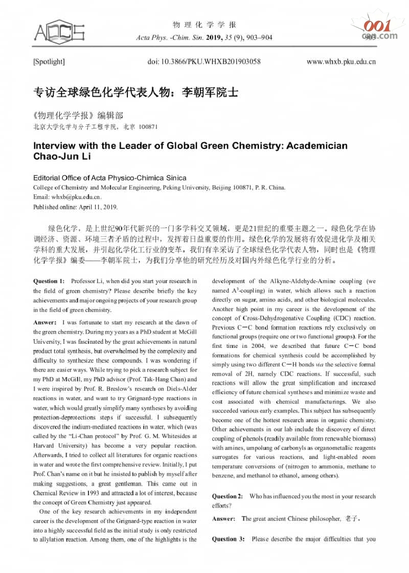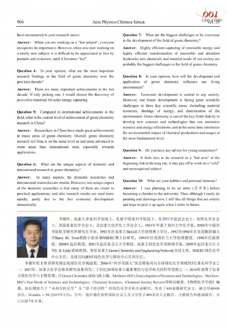 全球绿色化学代表人物:加拿大皇家科学院院士 C.J LI教授